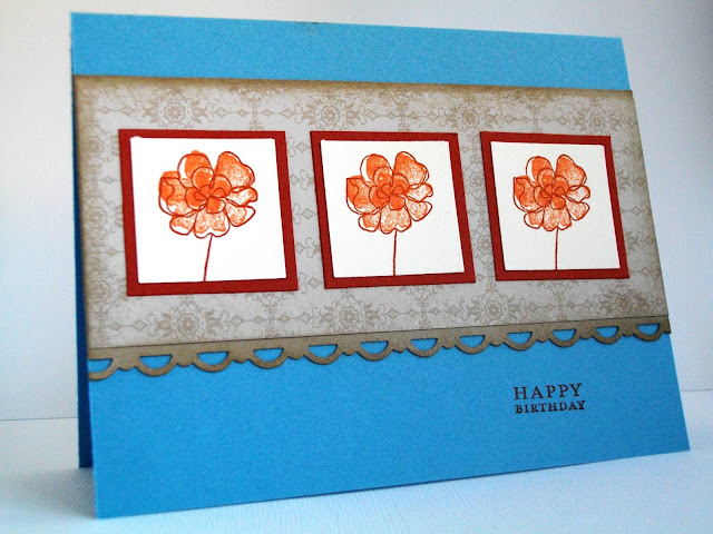Good morning stampers! Today's card features the Botanical Blooms set and the colour combo of Marina Mist, River Rock, Tangerine Tango and Cajun Craze! It may seem like an odd combo, but the flowers look great stamped in Tangerine and Cajun. The Marina Mist looks pretty bright on here, so my picture is probably off a little, but it looks stunning in real life! This is one of those very simple, fast cards you can whip up when you suddenly need one in a pinch!